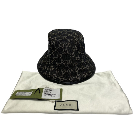 Chapéu Gucci Bucket confeccionado em tecido denin com logotipo da marca GG e acabamentos em couro na cor preta. Tamanho: S (57 cm)